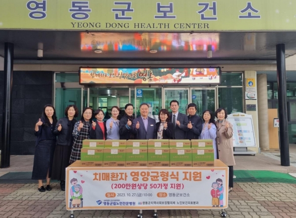 [충청뉴스큐] 충북 영동군 영동군립노인전문병원은 지난 27일 영동군지역사회보장협의체의 ‘치매환자 영양균형식 지원사업’에 뉴케어 50상자를 지원하고 영동군보건소에서 전달식을 가졌다.