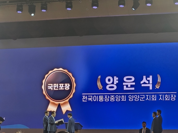 [충청뉴스큐] 양운석 전국이통장연합중앙회 양양군지회장이 11.2. 대전컨벤션센터에서 열린 “2023 대한민국 지방시대 엑스포 및 지방자치·균형발전의 날 기념식”에서 2023년 “지방자치 발전 유공“ 국민포장을 수상했다.