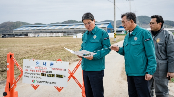 전염병 확산 방지를 위해 청남면 발생 농가 500m 인근 농로에서 방역 사항을 보고받으며 장평면 미당리 거점 소독시설로 이동해 소독 상황을 점검하고 근무자들을 격려했다.