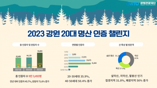 [충청뉴스큐] 강원특별자치도와 강원관광재단은 지난 3월부터 10월까지 진행한 ‘강원 20대 명산 인증 챌린지’ 운영을 통해 총 93,493명이 도내 명산을 방문했다고 밝혔다.