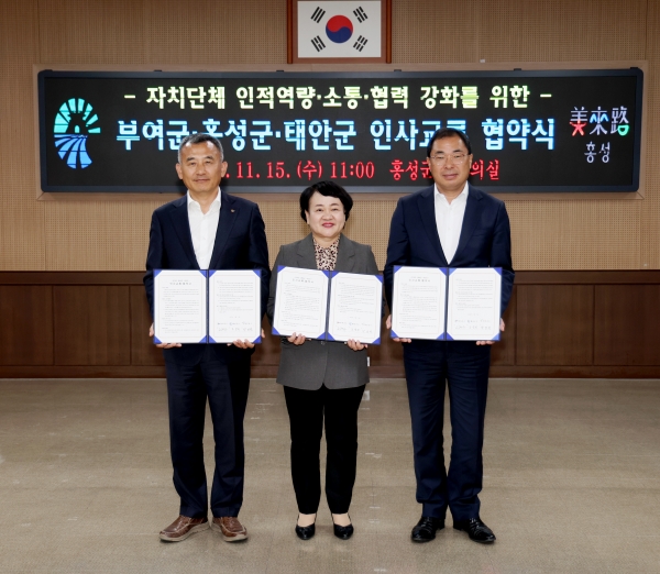 [충청뉴스큐] 홍성군이 행정역량을 강화하고 인근 지자체와 상호협력체계 구축을 통한 상생발전을 도모하기 위해 15일 홍성군청에서 부여군, 태안군과 인사교류 협약을 체결했다고 밝혔다.
