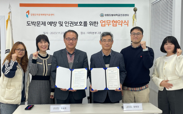 [충청뉴스큐] 강원도립대학교 학생상담센터와 인권센터는 강원도박문제예방치유센터와 22일 ‘도박문제 예방 및 인권보호’를 위한 업무협약을 체결했다.