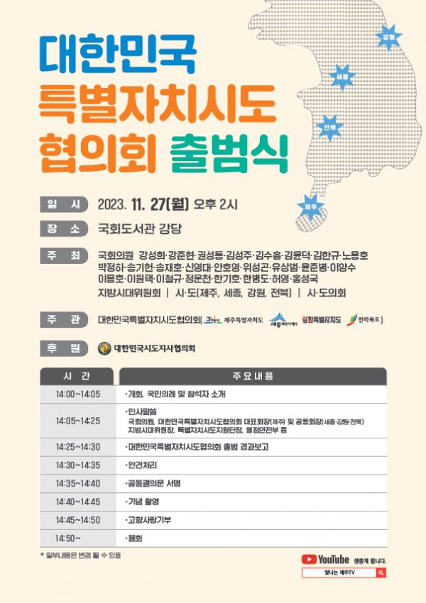 [충청뉴스큐] 강원특별자치도는 27일 오후 2시 국회도서관 강당에서 강원을 포함한 제주, 세종, 전북 4개 특별자치시·도 간 ‘대한민국특별자치시도협의회’ 출범식을 개최했다고 밝혔다.