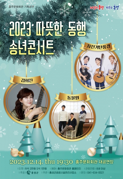 [충청뉴스큐] 홍성군 홍주문화회관은 2023년을 마무리하며 따뜻하고 감성 가득한 노래와 함께 추억을 떠올릴 수 있는 ‘2023 따뜻한 동행 송년 콘서트’를 오는 12월 14일 오후 7시 30분 무대에 올린다.