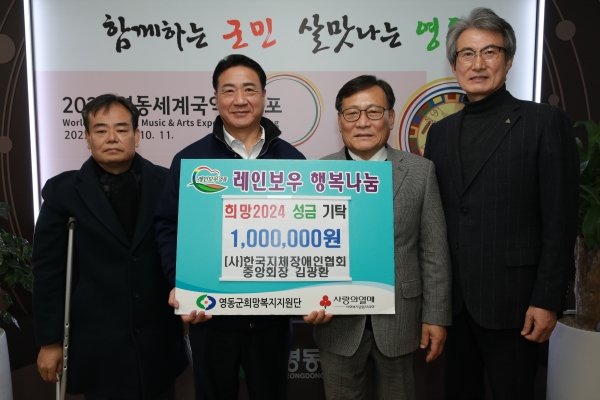 앞서 지난 18일에는 한국지체장인협의회가 성금 100만원, 삼양화학공업 영동공장 일반분해팀이 성금 50만원을 전달했다.