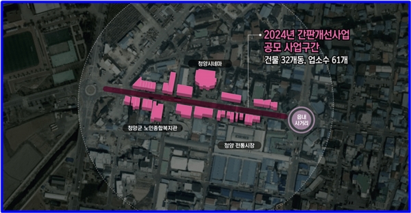 이번에 선정된 ‘청양읍 중앙로 간판개선 사업'은 청양사거리에서 청양중학교 방면 약 580m 구간에 있는 건물 32동, 61개 업소를 대상으로 하는 사업이다.