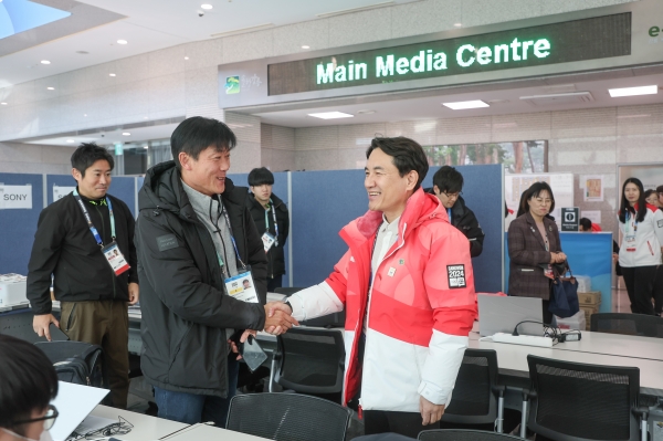 [충청뉴스큐] 김진태 강원특별자치도지사가 1.29. 강릉녹색도시체험센터에 마련된 2024강원동계청소년올림픽 메인미디어센터를 방문해 메인프레스 구역과 국제방송센터를 점검하고 국내외 취재진을 만나 격려 했다.