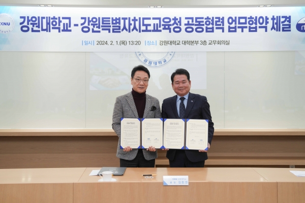 [충청뉴스큐] 강원특별자치도교육청은 1일 강원대학교와 함께 강원대학교 대학 본부 3층 교무회의실에서 우수한 지역인재의 지역대학 진학을 통한 역량 있는 지역인재 양성 및 필수 의료체계 구축을 위한 업무협약을 체결했다.