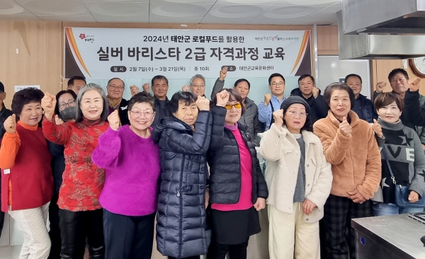 [충청뉴스큐] 태안군이 지난 7일 태안교육문화센터에서 군 관계자와 교육생 20명 등이 참석한 가운데 ‘태안 로컬푸드를 활용한 실버 바리스타 2급 자격과정’ 개강식을 열고 먹거리 전문인력 양성에 돌입했다.
