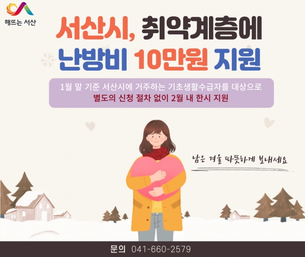 이완섭 서산시장은 “이번 지원을 통해 지속되는 한파에도 경제적 부담 때문에 난방에 어려움을 겪었을 취약계층 가구에 조금이나마 보탬이 되길 바란다”며 “시민이 지역사회에서 소외되지 않도록 다양한 방안을 추진하는데 최선을 다하겠다”고 말했다.