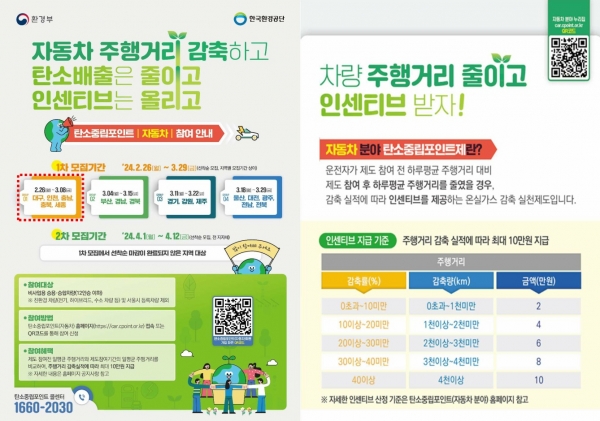 올해 10월까지의 주행거리 감축실적에 따라 최대 10만원의 인센티브가 지급될 예정이며 감축 실적 산정은 한국환경공단에서 과거 누적 주행거리에 따른 기준 주행거리를 참여 시점부터 참여 종료 시점까지의 주행거리와 비교해 산정한다.