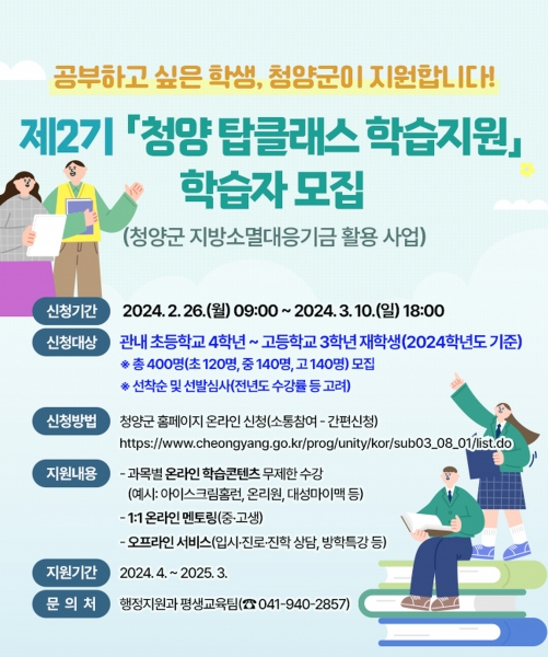 [충청뉴스큐] 청양군이 3월 10일까지 2기 탑클래스 학습지원 신청자를 접수한다고 27일 밝혔다.