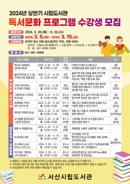 [충청뉴스큐] 충남 서산시가 5일부터 15일까지 상반기 독서문화프로그램에 참여할 수강생을 선착순 모집한다.