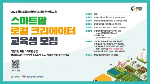 [충청뉴스큐] 청양군이 오는 29일까지 충남도립대학교 내 청양로컬스타센터에서 진행될 예정인 지능형 농장 교육에 참여할 수강생을 모집한다.