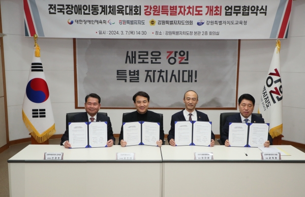 [충청뉴스큐] 김진태 강원특별자치도지사가 3.7. 14:30에 도청 본관2층 소회의실에서 정진완 대한장애인체육회장, 권혁열 도의회의장, 신경호 교육감과 함께 전국장애인동계체육대회 강원특별자치도 단독 개최를 위한 업무 협약을 체결했다.