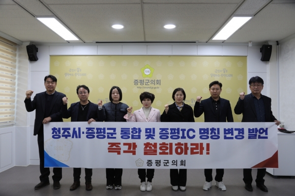 [충청뉴스큐] 증평군의회는 8일 오후 성명서를 내고 청주시·증평군 통합과 증평IC 명칭 변경 발언을 강력히 규탄하며 즉각 철회할 것을 촉구했다.