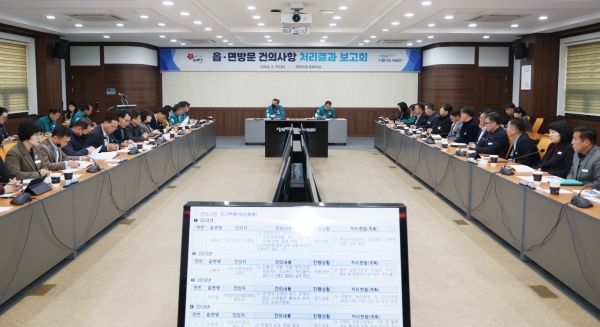 군은 19일 군청 중회의실에서 가세로 군수와 부서장, 읍면장 등 50여명이 참석한 가운데 ‘민선7·8기 읍면방문 건의사항 처리결과 보고회’를 갖고 지난 7년간 접수한 군민 건의사항의 추진상황을 점검했다.