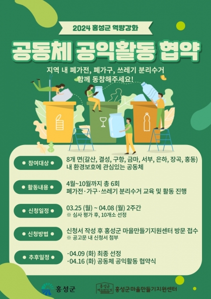 [충청뉴스큐] 홍성군 마을만들기지원센터는 지역 환경오염 문제에 대응하기 위한 새로운 노력으로 지역 내 지속 가능한 발전을 위한 활동을 촉진하기 위해 ‘공동체 공익활동 협약’사업을 오는 4월 8일까지 공모한다고 27일 밝혔다.