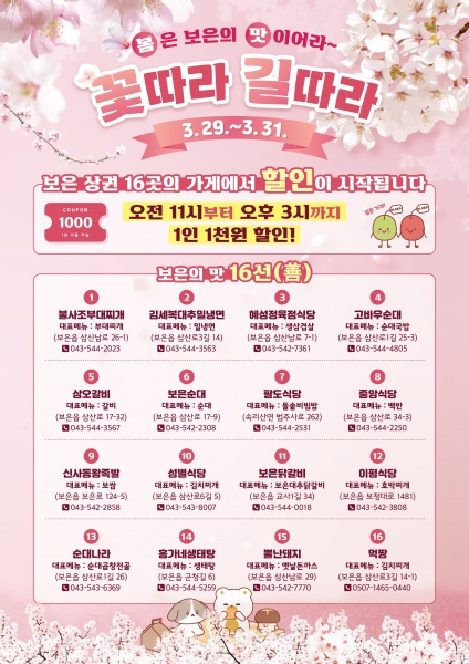 [충청뉴스큐] 보은군은 오는 29일부터 열리는 2024 보은 벚꽃길 축제 성공을 기원하기 위해 보은의 맛 대표 16선 식당이 1인당 1천원 할인행사를 한다고 밝혔다.