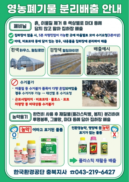 영농폐비닐은 이물질을 제거한 후 색상·재질별로 분리해 배출해야 하며 농약용기는 내용물을 완전히 비운 후 플라스틱과 봉지류를 분리해 전용수거함 또는 공동집하장에 배출해야 한다.