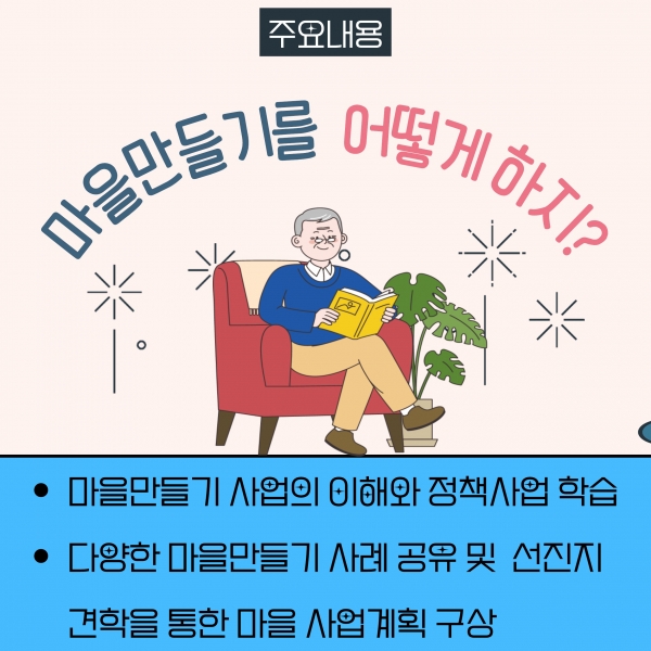 각 회차별 교육내용은 ▲마을만들기사업의 이해와 추진방향 소개 ▲주민주도 마을만들기에 필요한 기본사항 소개 ▲역량단계별 마을만들기 정책사업 소개 및 마을만들기 사례 공유 ▲선진지 견학 ▲참가자 별 마을 자원을 활용한 동아리 사업계획 수립이며 각종 마을 사업계획을 구상해 볼 수 있는 매우 좋은 기회가 될 것이다.