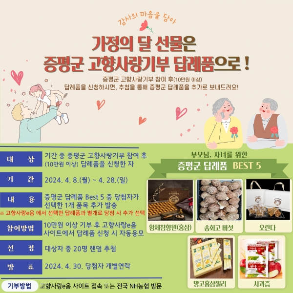 [충청뉴스큐] 충북 증평군이 5월 가정의 달을 맞이해 고향사랑 기부자에게 답례품을 추가로 제공하는 이벤트를 개최한다.