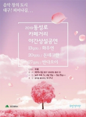 동성로 카페 야간상설공연은 과거 요정이 흥했던 종로에 지난해 9월 자비로 풍류문화 전시관 등을 조성한 ‘피어나길’의 카페 설하정 앞마당에서 13일부터 5월 25일까지 매주 토요일 저녁 7시에 총 7회 개최한다.