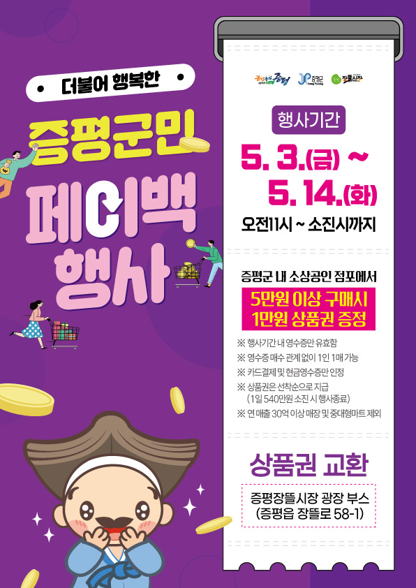 [충청뉴스큐] 충북 증평군이 이달 3일부터 14일까지 12일간 ‘더불어 행복한 증평군민 페이백 행사’를 개최한다.