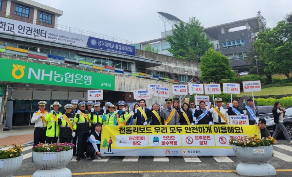 [충청뉴스큐] 공주시와 공주경찰서는 지난 7일 신관동 국립공주대학교 후문 앞에서 이륜차 및 개인형 이동장치 안전운행 캠페인을 진행했다.