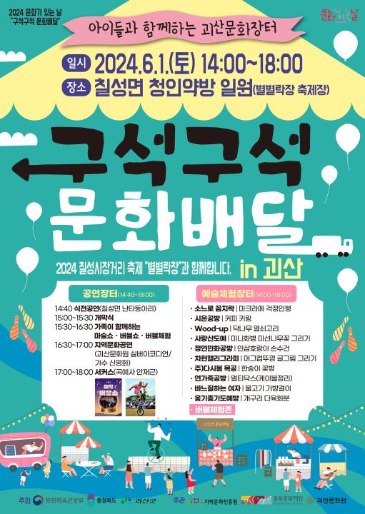 괴산군은 문화체육관광부의 2024 문화가 있는 날 ‘구석구석문화배달’ 광역공모에 충청북도와 함께 선정됐으며 사업시행은 괴산문화원이 맡는다.
