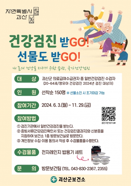 [충청뉴스큐] 충북 괴산군보건소는 의료급여 수급권자를 대상으로 국가건강검진 수검 독려 이벤트를 진행한다고 밝혔다.