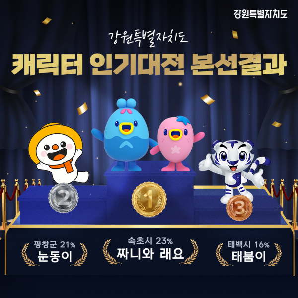 지난 5월 10일부터 6월 4일까지 사회관계망서비스를 통해 예선 본선 합계 총 26,406명이 투표한 ‘강원특별자치도 캐릭터 인기대전’에서 △1위 속초시 짜니와 래요, △2위 평창군 눈동이, △3위 태백시 태붐이가 도내 인기 캐릭터로 선정됐다.