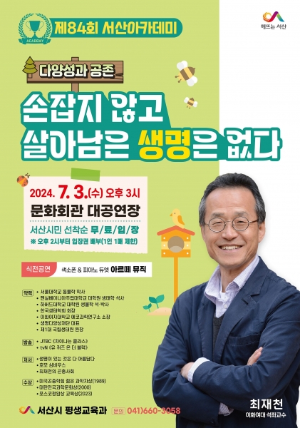 [충청뉴스큐] 충남 서산시는 생물학자 최재천 교수를 초청해 7월 3일 오후 3시 서산시문화회관 대공연장에서 제84회 서산아카데미를 개최한다고 밝혔다.