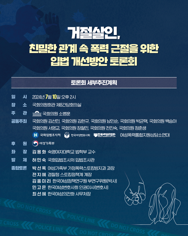 이번 토론회는 김용화 숙명여자대학교 법학부 교수가 좌장을 맡아 진행하며 허민숙 국회입법조사처 조사관이 ‘거절 살인, 규율에 실패해 온 이유 : 강압적 통제 행위 범죄화 입법과제’를 주제로 발제한다.