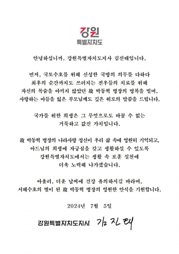김진태 강원특별자치도지사는 서한문을 통해, “국토수호를 위해 신성한 국방의 의무를 다하다 최후의 순간까지도 쓰러지는 전우들의 치료를 위해 자신의 목숨을 아끼지 않았던 고 박동혁 병장의 안식을 기원한다”고 위로의 말씀을 전하고 “고 박동혁 병장의 나라사랑 정신이 우리 삶 속에 영원히 기억되고 아드님의 희생에 자긍심을 갖고 생활하실 수 있도록 강원특별자치도에서는 생활 속 보훈 실천에 더욱 노력해 나가겠다”고 언급했다.