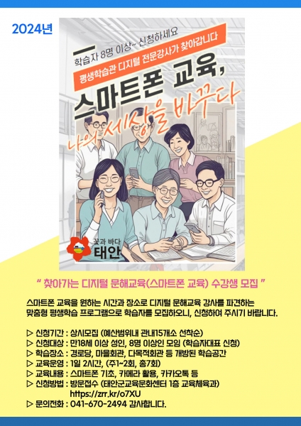 군은 군민들이 원하는 시간과 장소에서 편리하게 스마트폰 활용 교육을 받을 수 있도록 디지털 문해교육 강사를 파견하는 ‘2024 태안군 찾아가는 디지털 문해교육’을 11월까지 실시키로 하고 신청자를 상시 모집한다고 9일 밝혔다.