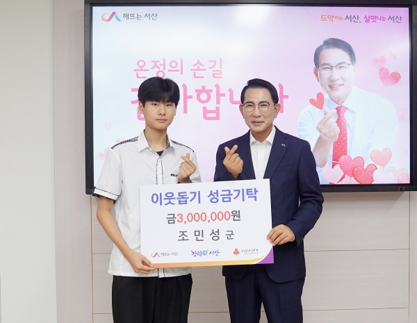 [충청뉴스큐] 충남 서산시는 조덕래 씨와 그의 아들 조민성 군이 지역사회에 온정을 전하기 위해 9일 300만원의 성금을 기탁했다고 밝혔다.