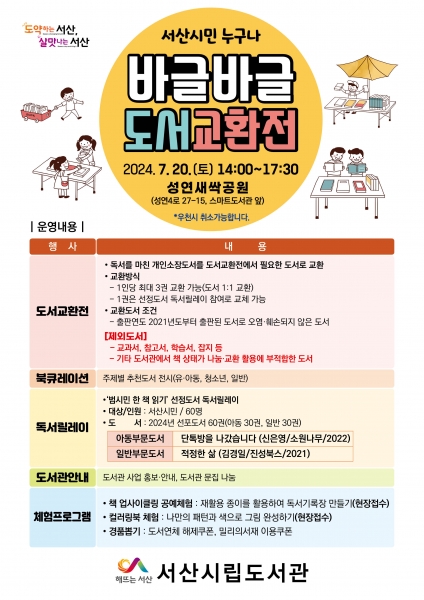 [충청뉴스큐] 충남 서산시는 성연면 새싹공원에서 20일 오후 2시부터 오후 5시 30분까지 ‘바글바글 도서교환전’을 개최한다고 밝혔다.