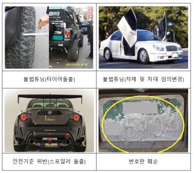 주요 불법 튜닝 사례로는 고광도전조등 설치, 소음기 및 연료장치 임의 변경, 밴형 화물용 자동차의 승용 자동차로의 변경, 차체 너비·높이 개조 등이 있으며 안전기준 위반 사례로는 철제 범퍼가드 설치, 각종 등화를 기준에 맞지 않는 색상으로 바꿔 단 경우 등이다.