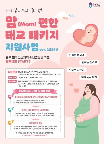[충청뉴스큐] 충북 괴산군보건소는 관내 임신부를 대상으로 ‘맘 편한 태교 패키지 지원 사업’을 실시한다고 밝혔다.
