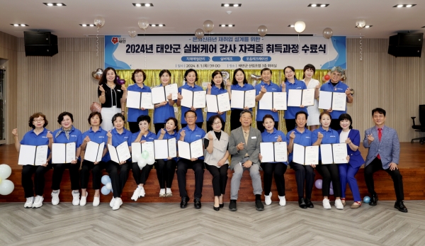[충청뉴스큐] 태안군이 지난 1일 태안읍에 위치한 태안군 산림조합 회의실에서 가세로 군수 등 군 관계자와 교육생, 노인복지 및 요양기관 관계자 등 30여명이 참석한 가운데 ‘태안군 실버케어 강사 자격증 취득과정 수료식’을 갖고 18명의 수료생을 배출했다고 밝혔다.