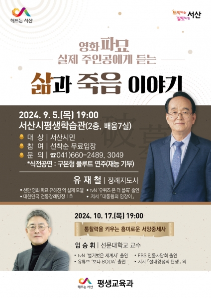 성기영 서산시 평생교육과장은 “이번 강연을 통해 시민들이 삶과 죽음이라는 주제를 깊이 있게 성찰하고 이를 통해 삶의 가치를 재발견하는 기회가 되길 바란다”며 “앞으로도 다양한 주제의 강연을 통해 시민 여러분께 의미 있는 프로그램을 제공할 수 있도록 최선을 다하겠다”고 말했다.