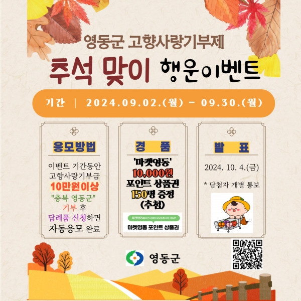 [충청뉴스큐] 충북 영동군은 추석 명절을 맞아 영동군 고향사랑기부제를 홍보하고자 ‘추석 맞이 행운 이벤트’를 9월 30일까지 진행한다.