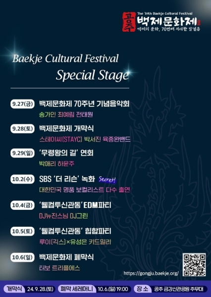 29일에는 대한민국 대표 국악인 박애리와 정가여신 하윤주가 ‘무령왕의 길’ 연회장에 출연하고 10월 2일에는 믿고 듣는 힐링 버스킹 프로그램인 SBS 음악 예능 ‘더 리슨’ 녹화가 금강신관공원 행사장에서 진행된다.