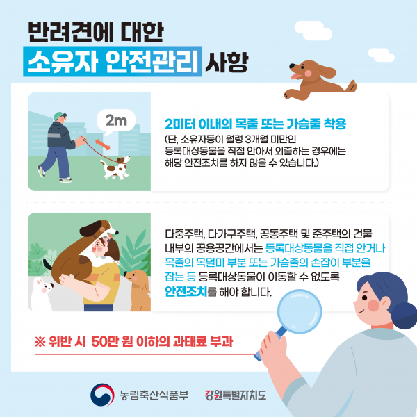 [충청뉴스큐] 강원특별자치도는 반려동물 동반 행사 등 각종 야외활동이 빈번한 가을철을 맞아 2024년 하반기 반려견 소유자 준수사항 홍보 및 현장단속을 10월 1일부터 10월 31일까지 도 내 18개 시군에서 실시한다고 밝혔다.