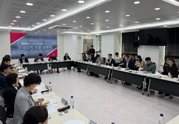 [충청뉴스큐] 강원특별자치도는 2일 10시, 강원도립대학교 세미나실에서 김상영 관광국장 주재로 도와 18개 시군 관광과장, 강원관광재단 관계자 등 60여명이 참석한 가운데 ‘2025년 강원 관광정책 시군 설명회’를 개최했다.