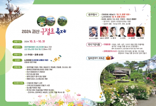 이외에도, 축제장에서는 구절초청·고추다대기 만들기 시연, 다양한 먹거리, 괴산 지역의 농·특산물 판매 등이 준비돼 방문객들이 시중보다 저렴한 가격에 다양한 상품을 구매할 수 있다.