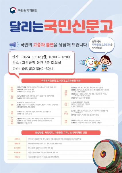 [충청뉴스큐] 충북 괴산군은 오는 18일 오전 10시부터 오후 4시까지 괴산군청 3층 대회의실에서 군민들의 고충을 청취하고 해결 방안을 모색하는 ‘달리는 국민신문고’를 운영한다고 밝혔다.