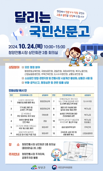 [충청뉴스큐] 청양군은 오는 24일 청양 전통시장 상인회관 2층에서 국민권익위원회 주관 2024년 맞춤형 ‘달리는 국민신문고’를 운영한다.