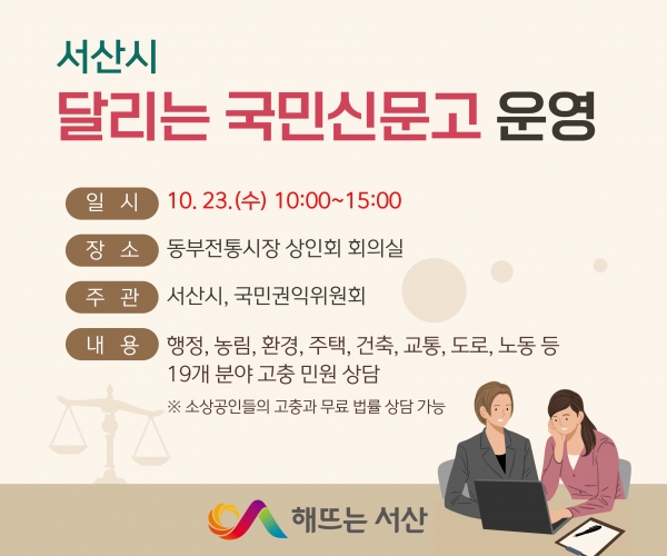 [충청뉴스큐] 충남 서산시는 23일 오전 10시부터 오후 3시까지 동부전통시장 상인회 회의실에서 ‘달리는 국민신문고’를 운영한다고 밝혔다.